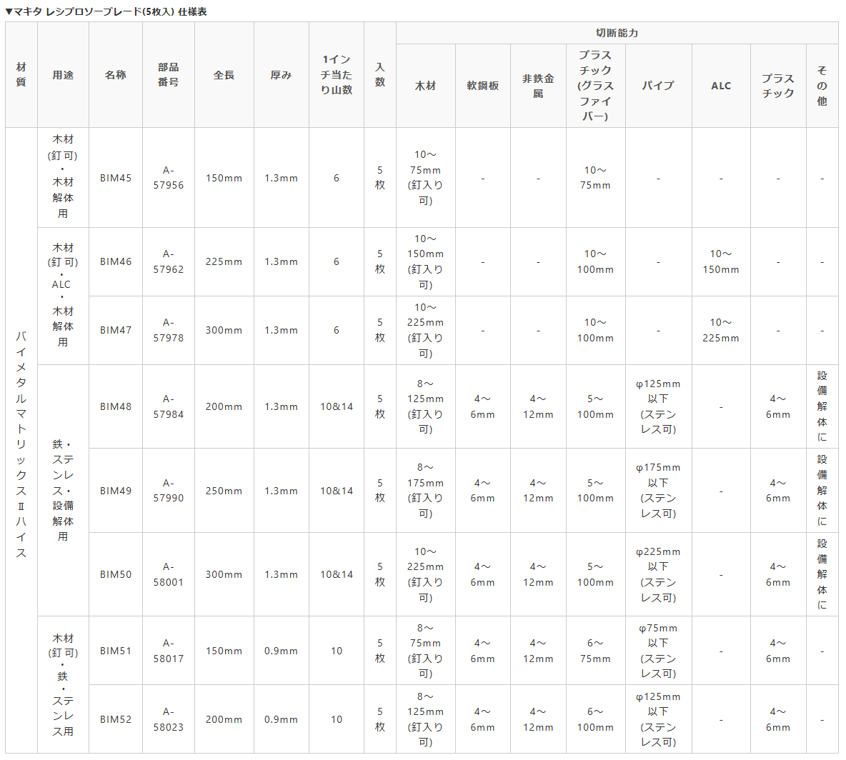全長:140~169mm、刃厚:1.3mm、山数(1インチあたり):3~9