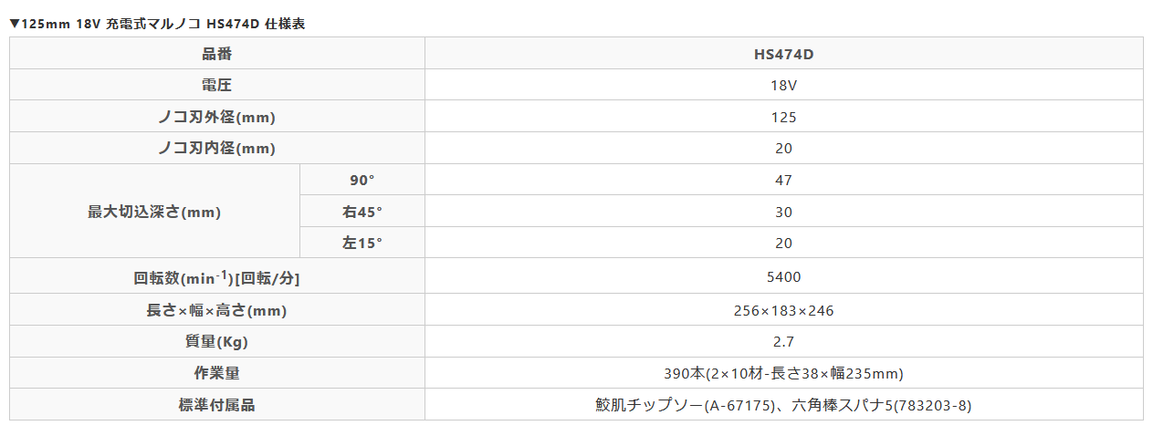 ・型番: HS474DZ 18V 125mm充電式マルノコ 鮫肌チップソー付